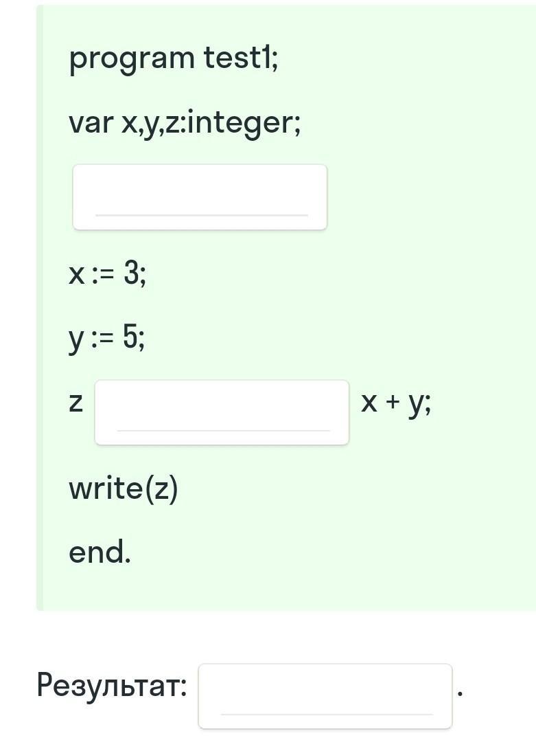 ДОПИШИТЕ ПРОПУЩЕННЫЕ КОМАНДЫ ПРОГРАММЫ И ВПИШИ РЕЗУЛЬТАТ ВЫПОЛНЕНИЯ ПРОГРАММЫ