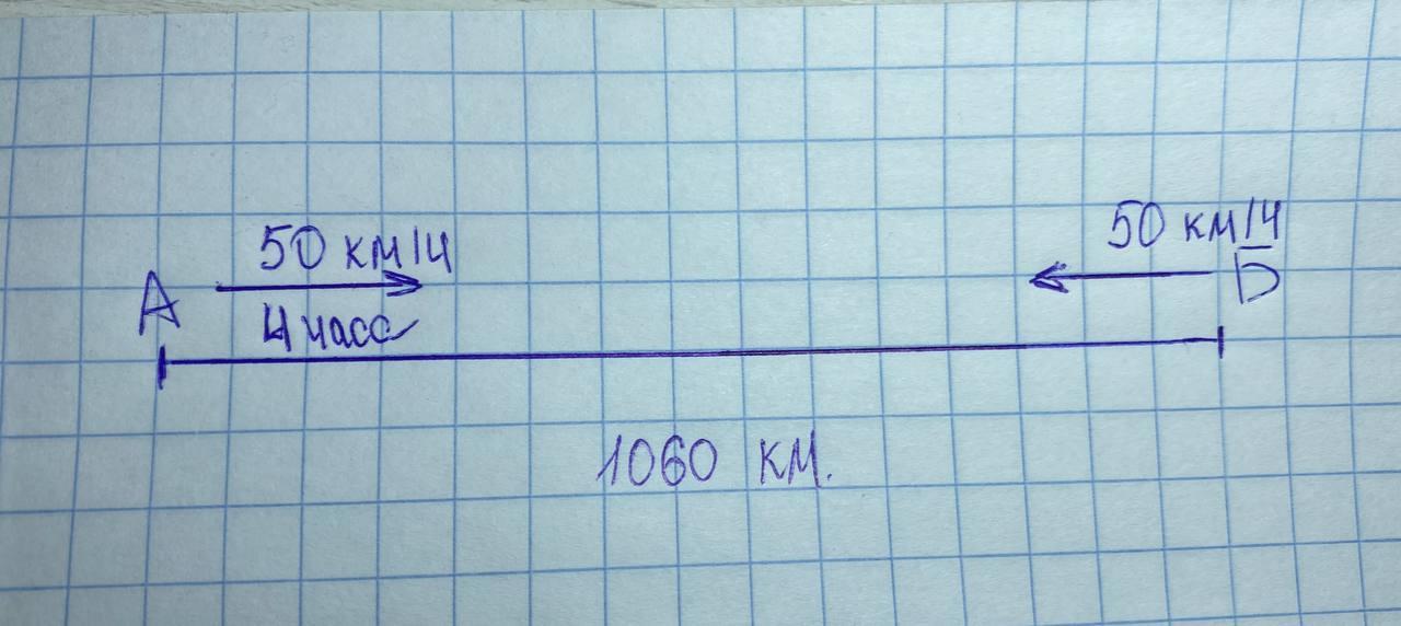 Расстояние между городами А и Б равно 1060 км.Из города А отправился поезд со скоростью 50 км/ч , а через 4 ч навстречу ему отправился поезд из города Б со скоростью 50 км/ч.Через сколько часов после отправления второго поезда и на каком расстоянии от города А встретятся эти поезда ?