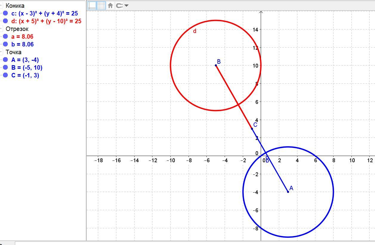 а) Из задания определяем радиус заданной окружности R = √25 = 5 и координаты центра – пусть это точка А(3; -4).