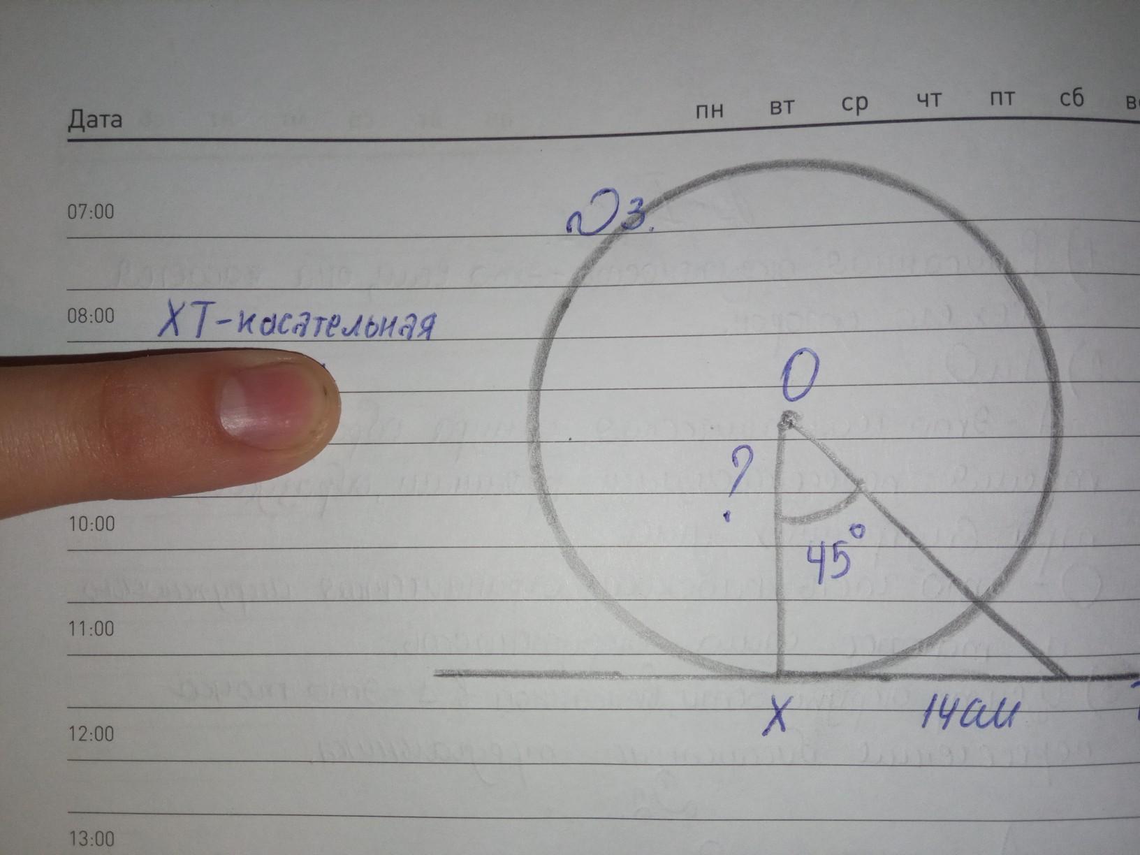 1) OXT = 90 (грд) т.к. XT - касательная к окружности => треугольник прямоугольный и третий угол равен 90-45=45