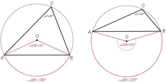 Пусть центр описанной окружности (O) внутри треугольника. Соединим его с вершинами. Получим центральные углы (AOB, BOC, AOC) меньше 180° и дуги (AB, BC, AC) меньше 180°. Тогда вписанные углы (A, B, C), опирающиеся на эти дуги, меньше 90° (вписанный угол равен половине дуги, на которую опирается).