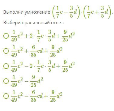 1) \frac{1}{49}c^2-\frac{9}{25}d^2\\2) (u^3g^6-1)(u^3g^6+1)\\3) 8d^3-4d^2c^5+2dc^{10}+4d^2c^5-2dc^{10}+c{15}= 8d^3+c^{15}\\4)25x^2-64y^2-25x^2=-64y^2=-64*0,01=-0,64