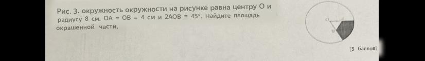 окружности на рисунке равна центру О и радиусу 8 см. ОА = ОВ = 4 см и LАОВ = 45°. Найдите площадь окрашенной части,