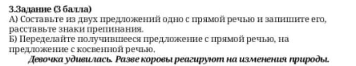 A) Составьте из двух предложений одно с прямой речью и запишите его, расставьте знаки препинания. Б) Переделайте получившееся предложение с прямой речью, на предложение с косвенной речью.