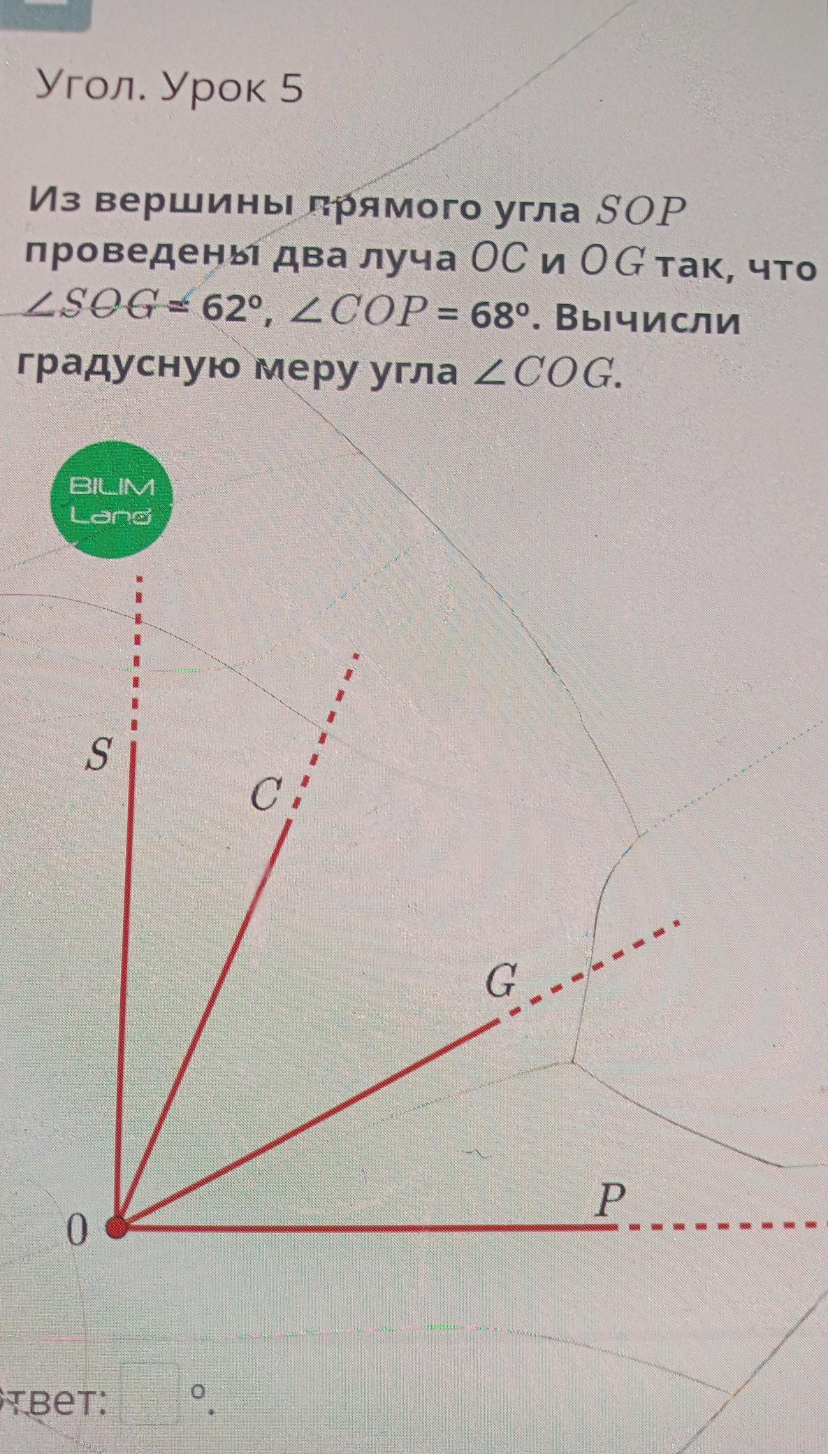 Из вершины прямого угла SOP проведены два луча ОС и 0G так, что ZSOG = 62° 2COP= 68°. Вычисли градусную меру угла 2COG. BILM Land