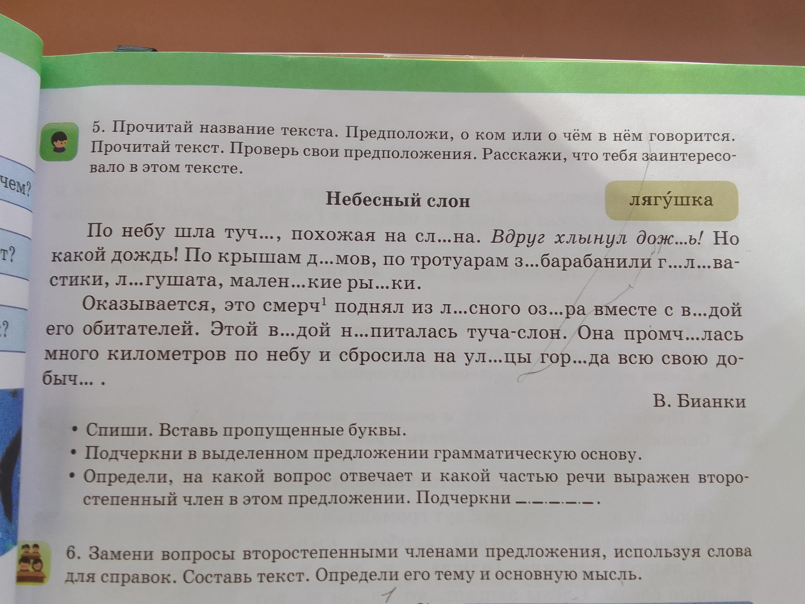 Ответ:По небу шла туча, похожая на слона. Вдруг хлынул дождь! Но какой дождь! по крышам домов, по тратуарам забарабанили головастики, лягушата, маленькие рыбки.