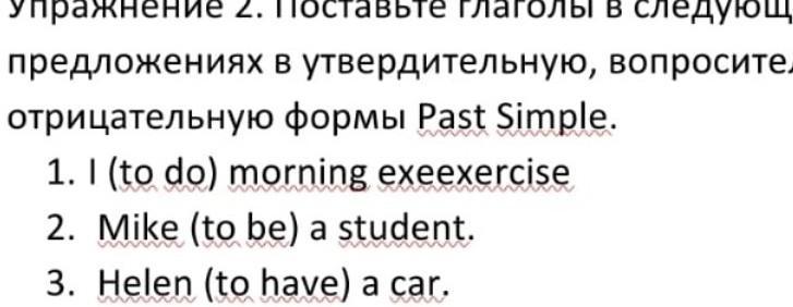 Упражнение 2. Поставьте глаголы в следующих предложениях в утвердительную, вопросительную и отрицательную формы Past Simple. 1. 1 (to do) morning exeexercise 2. Mike (to be) a student. 3. Helen (to have) a car. A