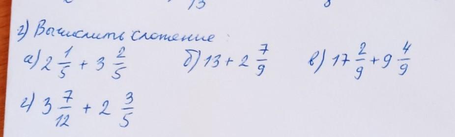 \displaystyle 1)2\frac{1}{5}+3\frac{2}{5}=(2+3)+(\frac{1}{5}+\frac{2}{5})=5+\frac{3}{5}=5\frac{3}{5}=\frac{28}{5}=5,6\\ \\2)13+2\frac{7}{9}=13+2+\frac{7}{9}=15+\frac{7}{9}=15\frac{7}{9}=\frac{142}{9}\\ \\3)17\frac{2}{9}+9\frac{4}{9}=(17+9)+(\frac{2}{9}+\frac{4}{9})=26+\frac{2}{3}=26\frac{2}{3}=\frac{80}{3}\\ \\4)3\frac{7}{12}+2\frac{3}{5}=(3+2)+(\frac{7}{12}+\frac{3}{5})=5+\frac{71}{60}=5+1\frac{11}{60}=5+1+\frac{11}{60}=6+\frac{11}{60}=\\\\6\frac{11}{60}=\frac{371}{60}