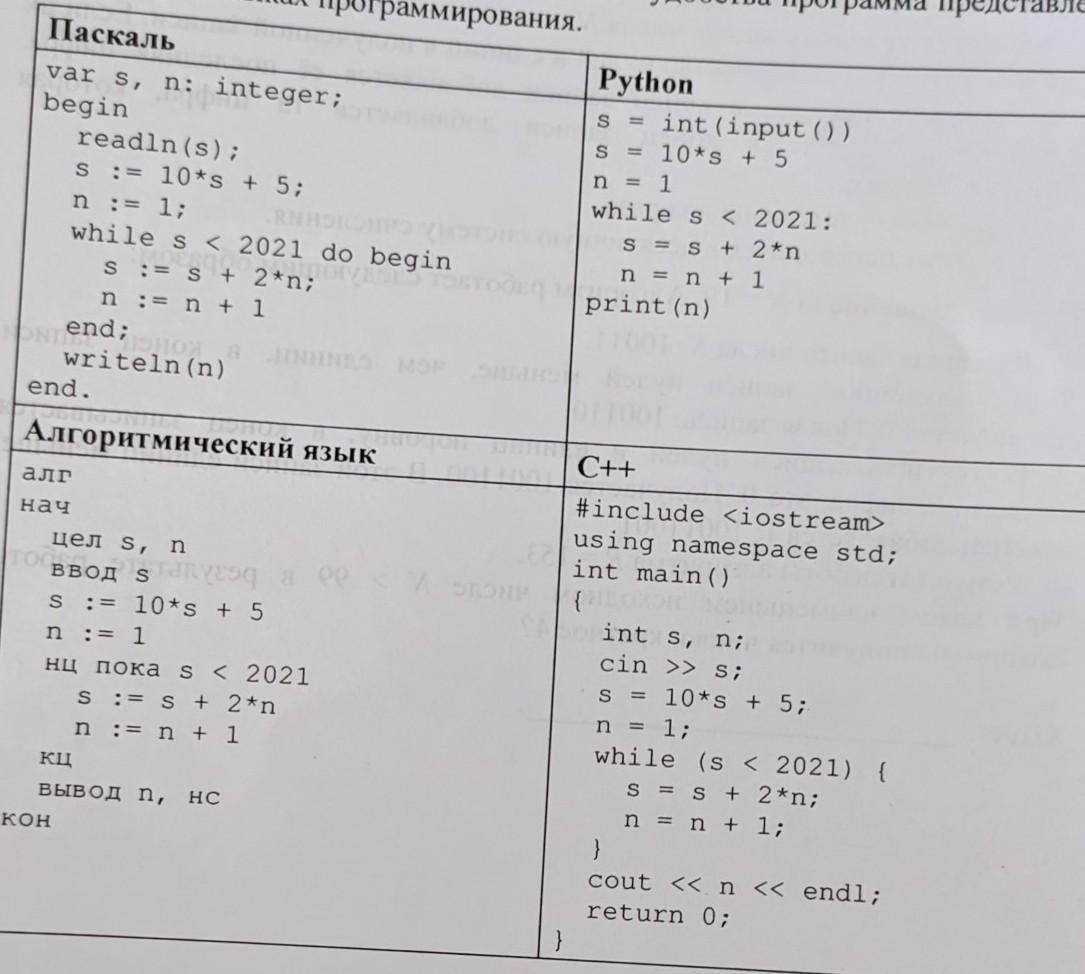 var S, Определите, при каком наименьшем введённом значении переменной программа выведет число 11. Для Вашего удобства программа представлена на четырёх языках программирования. Паскаль