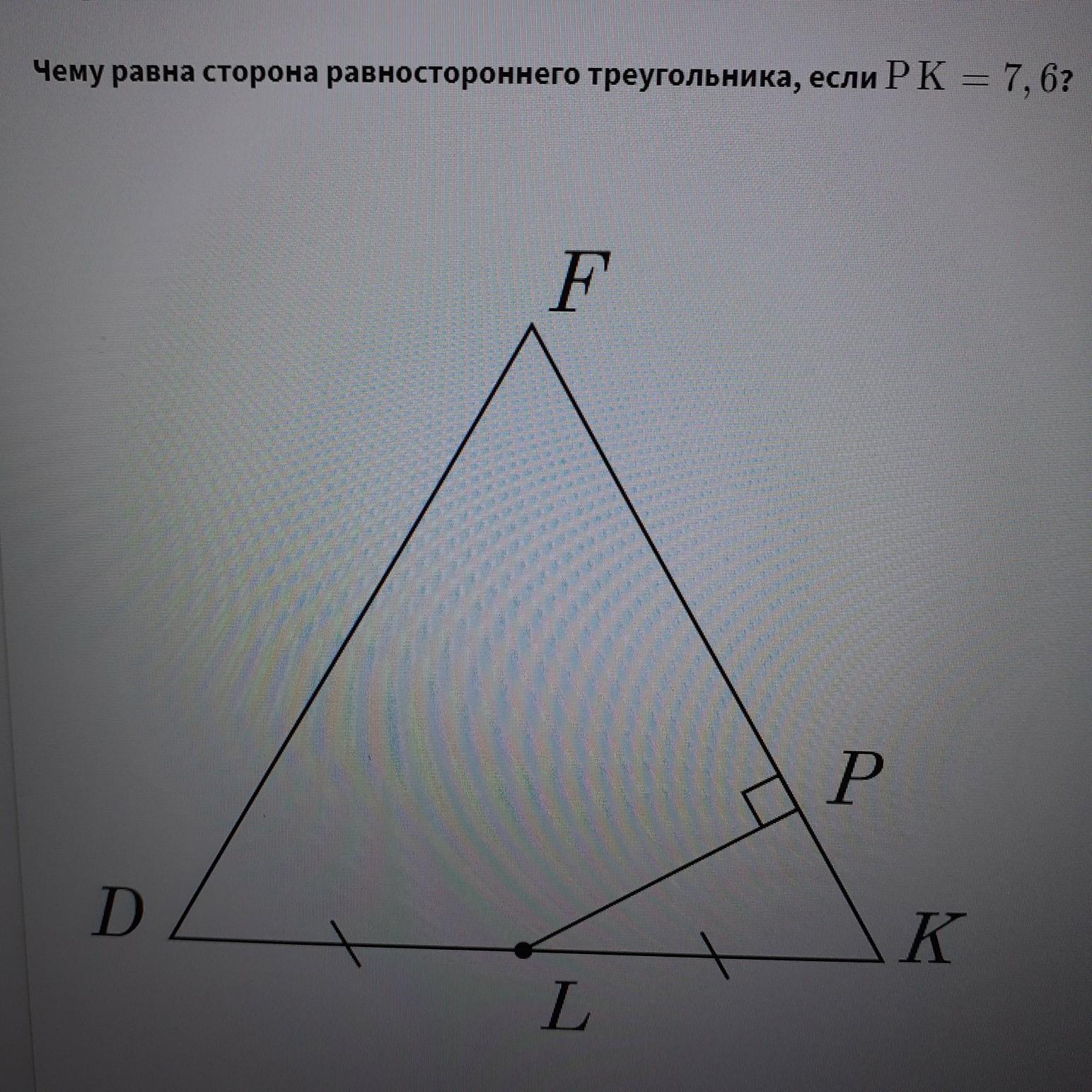 ∆PLK- прямоугольный треугольник, ∠К=60°, угол равностороннего треугольника.
