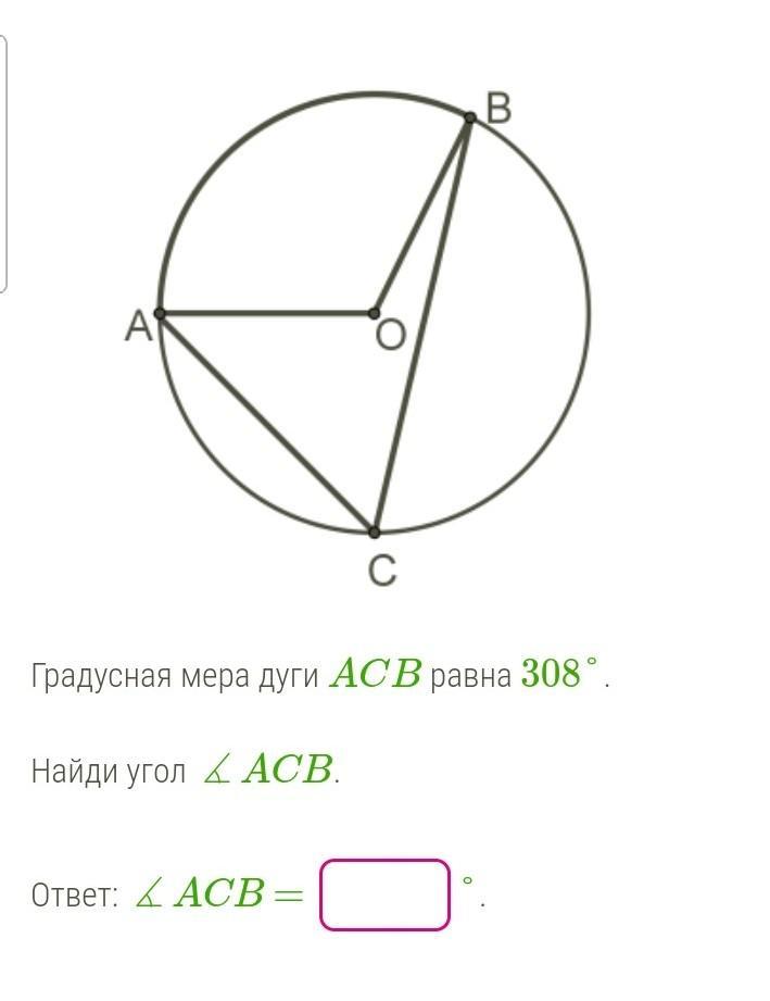 Дуга ACB равна 308°, значит дуга АВ равна 360-308=52 (°);