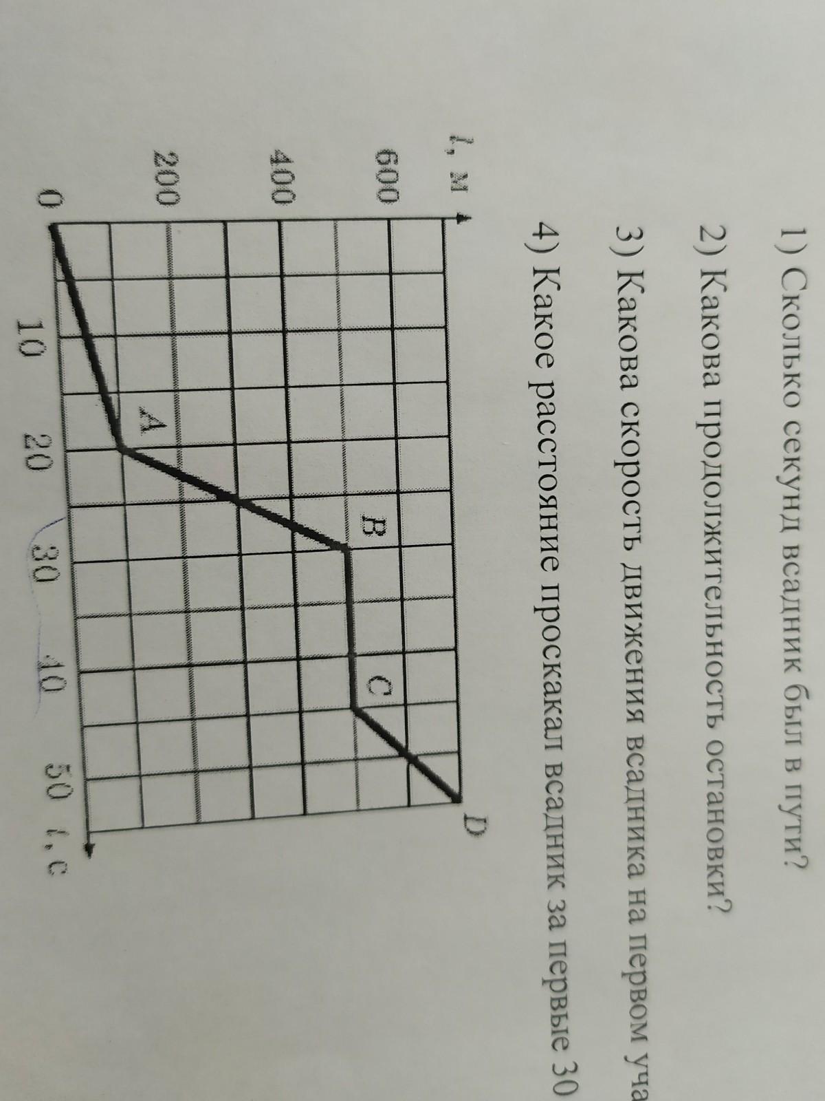 2. . Пользуясь графиком движения всадника, определите: 1) Сколько секунд всадник был в пути? 2) Какова продолжительность остановки? 3) Какова скорость движения всадника на первом участке 4) Какое расстояние проскакал всадник за первые 30 секу 1, м. D