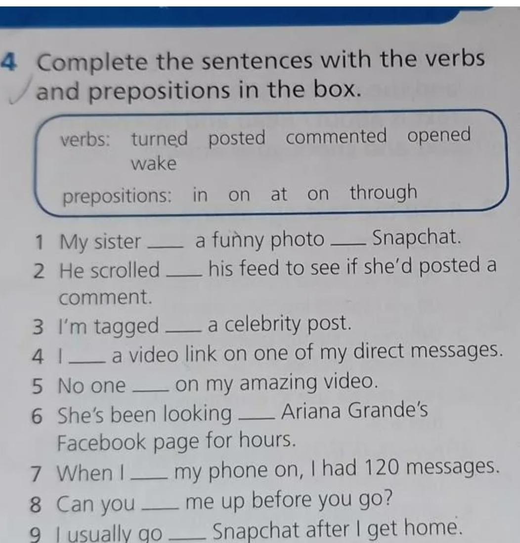 1 My sister a funny photo Snapchat 2 He serolled his feed to see if she'd posted a comment. 3 I'm tagged — a celebrity post. 4 1___ a video link on one of my direct messages. 5 No one on my amazing video. 6 She's been looking Ariana Grande's Facebook page for hours. 7 When I _-_ my phone on, I had 120 messages. 8 Can you me up before you go? 9 I usually go Snapchat after I get home.
