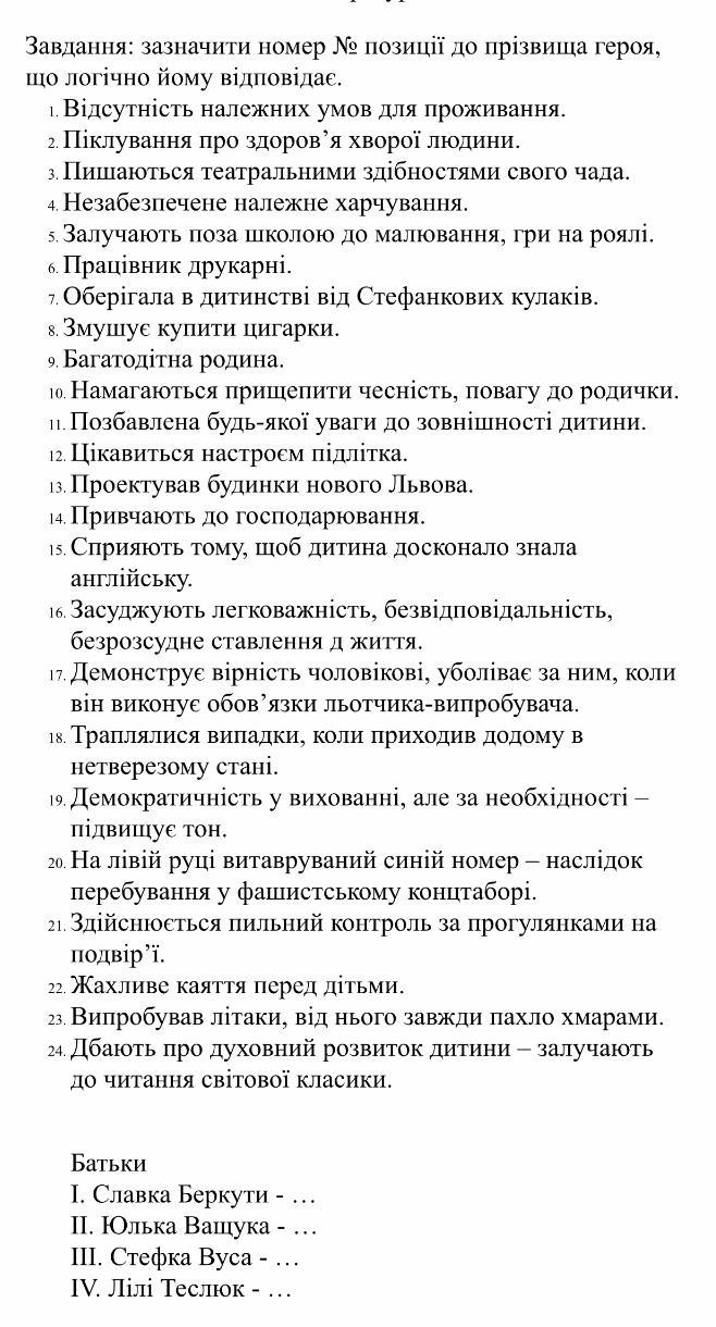 14. Привчають до господарювання - у Стефка це було не привчання, а виживання, Юлько домашніми справами зовсім не займався - усе робила мама, Славка батько, коли повернувся після аварії попросив заварити чай, а Лілі мила вікна. Кого з них двох: Славка чи Лілі - можна вважати такими, що їх привчають до господарування...