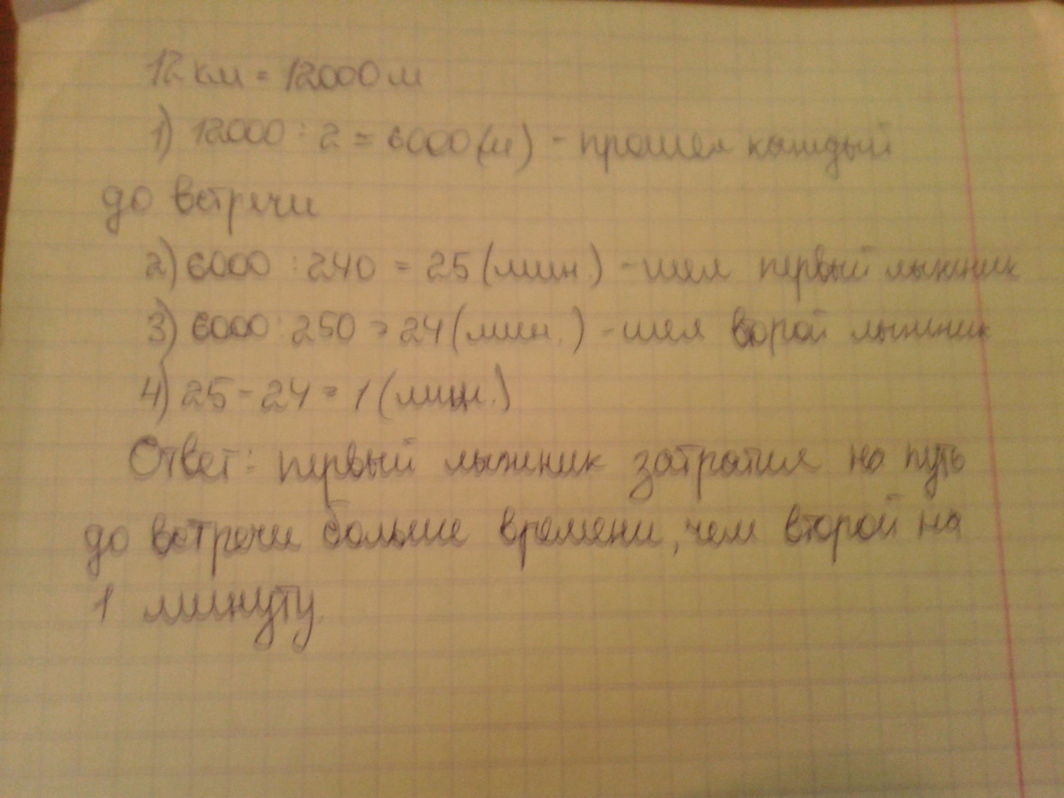 Из двух туристических баз, расстояние между которыми 12 км, навстречу друг другу вышли два лыжника и встретились на середине пути. Первый лыжник шёл со скоростью 240 м/мин, второй - 250 м/мин. Какой лыжник затратил на путь до встречи больше времени и на сколько?