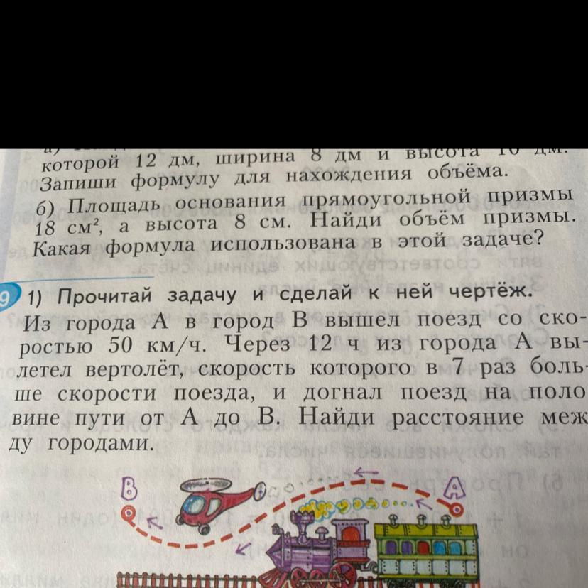Из города А в город В вышел поезд со скоростью 50 км/ч. Через 12 ч из города А вылетел вертолёт, скорость которого в 7 раз больше скорости поезда, и догнал поезд на половине пути от А до В. Найди расстояние между городами.