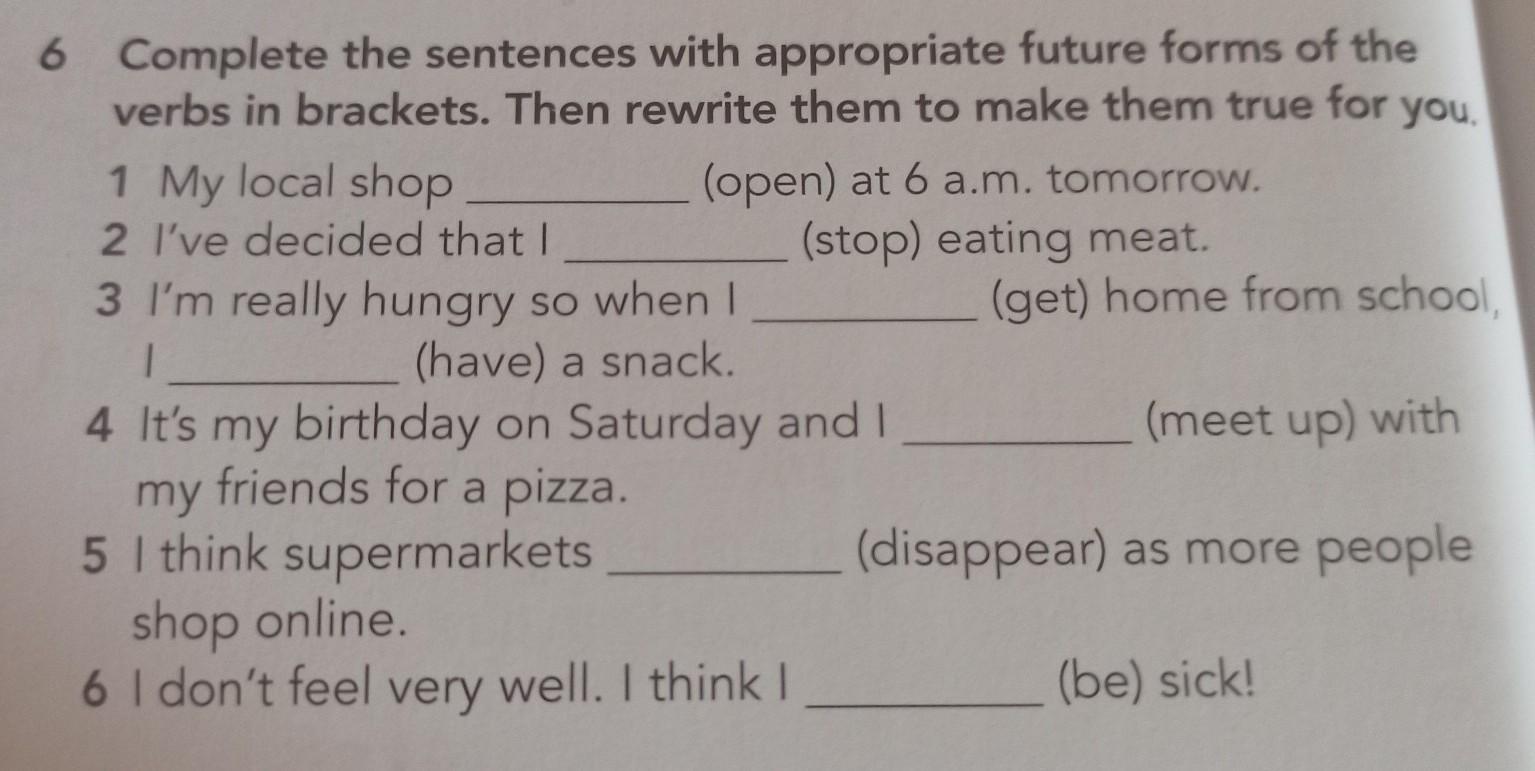 1) opens 2)stopped 3)get, will have 4) meeting 5) will disappear 6) am