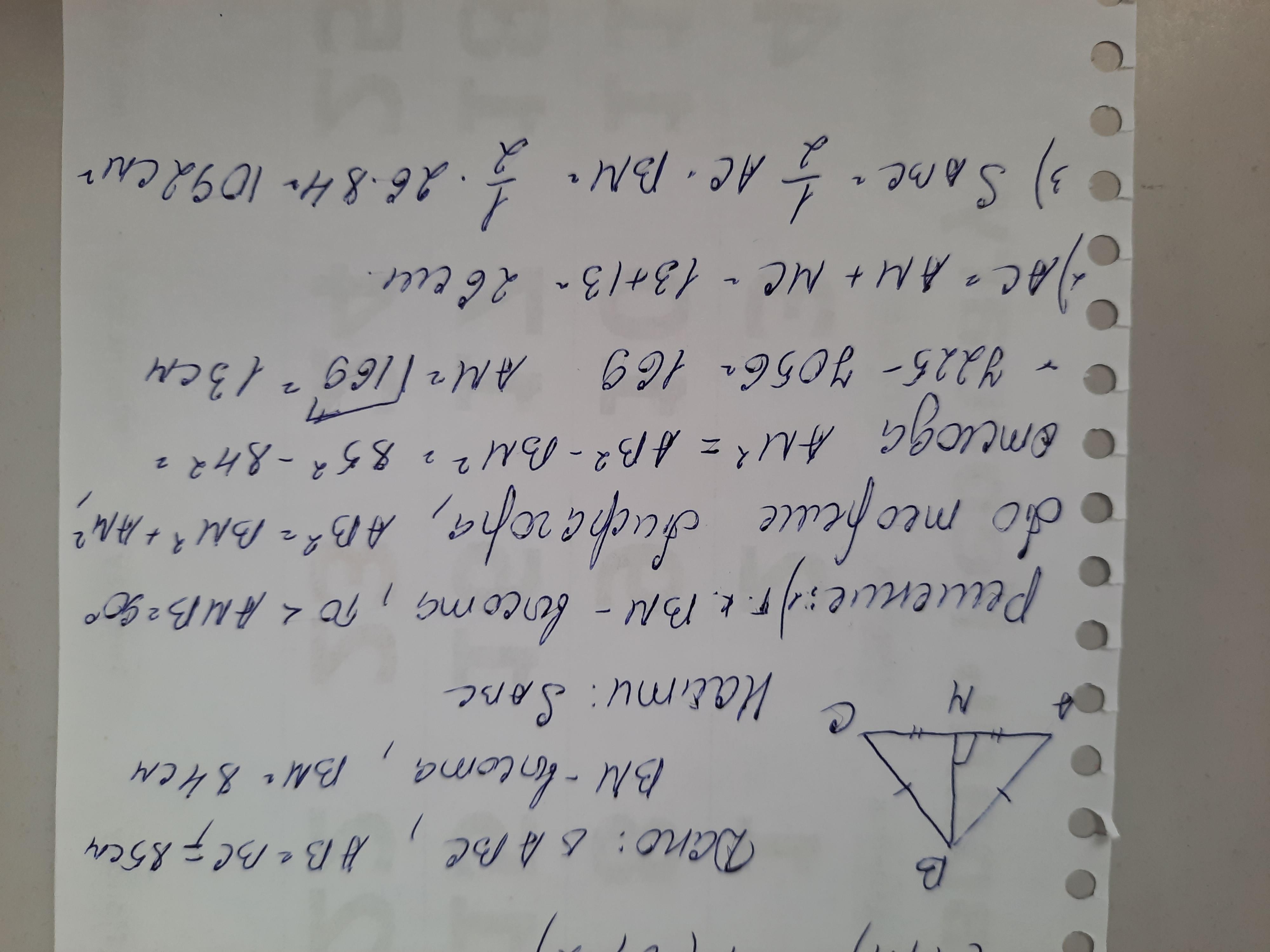 знайти площу рівнобедреного трикутника бічна сторона якого дорівнює 85см а висота опущена до основи, дорівнює 84см