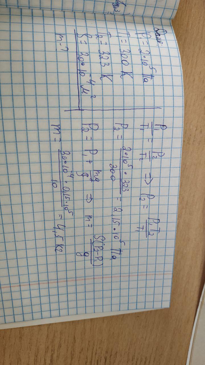 В цилиндре под поршнем находится воздух при давлении 2*10^5 Па и температуре 27°С. Груз какой массы нужно положить на поршень после нагревания воздуха до температуры 50 °С, чтобы объём воздуха в цилиндре остался неизменным? Площадь по перечного сечения поршня 30 см².