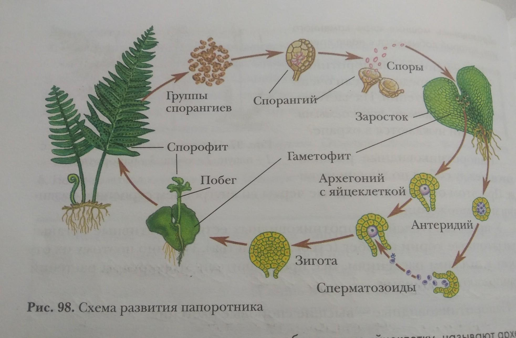 Цикл развития папоротника на картинке наверху.