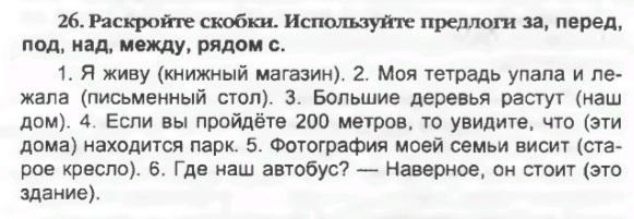 Я живу рядом с книжным магазином. Моя тетрадь упала и лежала под письменным столом . Большие деревья растут за нашим домом . Если вы пройдёте 200 метров , то увидите , что между этими домами находится парк. Фотография моей семьи висит над старым креслом. Где наш автобус? - наверное , он стоит перед этим зданием .