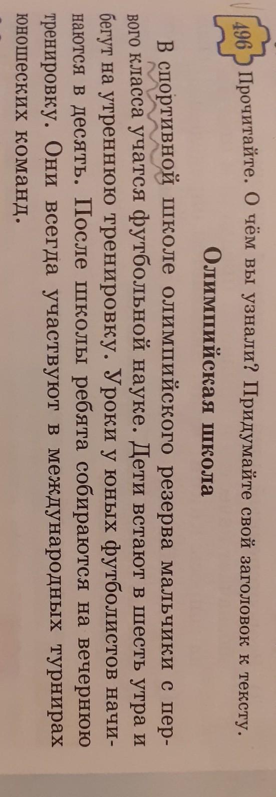 496 Прочитайте. О чём вы узнали? Придумайте свой заголовок к тексту. Олимпийская школа В спортивной школе олимпийского резерва мальчики с пер- вого класса учатся футбольной науке. Дети встают в шесть утра и бегут на утреннюю тренировку. Уроки у юных футболистов начи- наются в десять. После школы ребята собираются на вечернюю тренировку. Они всегда участвуют в международных турнирах юношеских команд.