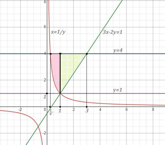 Если спроектировать область на ось ОХ , то изменения х будут в пределах от 1/4 до 1 в первой области , и от 1 до 3 во второй области .