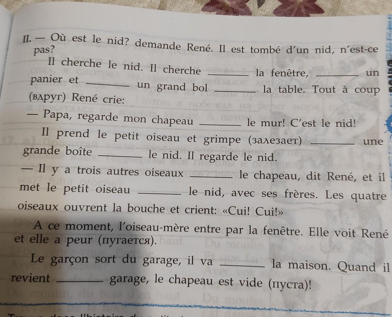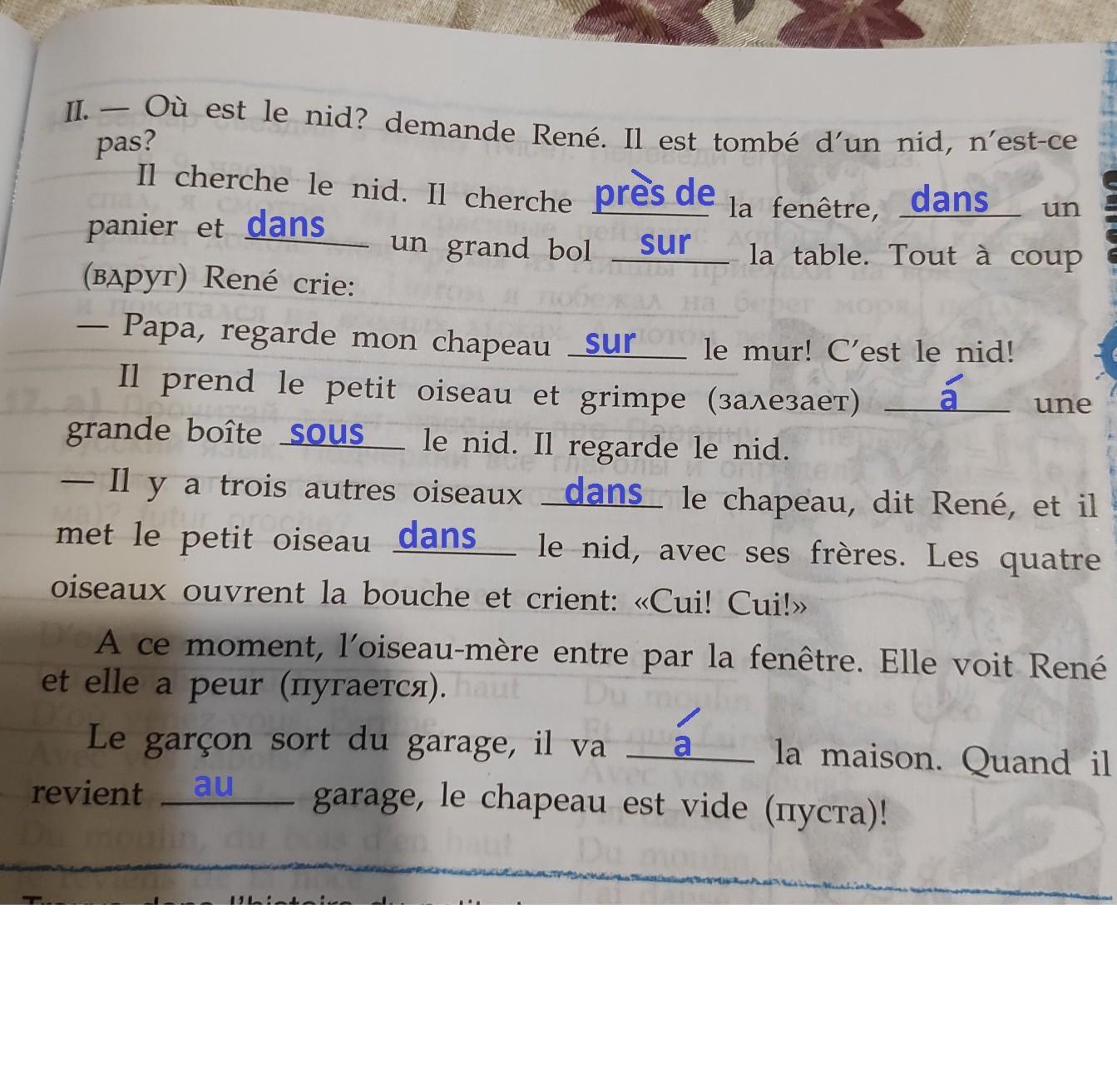 Del to (naus 13. Lis l'histoire de J. Spink «Dans le garage», mets les prepositions dans, sur, sous, près de, à, au à leur place.si Dans le garage 1. René est le garage avec son père. Monsieur Gautier tra- vaille et René est assis une grande boîte la porte du garage. Il se lève vite. - C'est le mois de mai et il fait chaud. René entend: «Cui! Cui!» — C'est un petit oiseau, n'est-ce pas? dit-il. Son père écoute un C'est vrai. C'est un oiseau, dit son père. upad Mais où est-il? demande René. moment. Il cherche l'auto, une petite boîte, une chaise, et voilà le petit oiseau. Il est gris et très mignon. Il saute (прыгает) la main de René. podoildid помогите пожалуйста