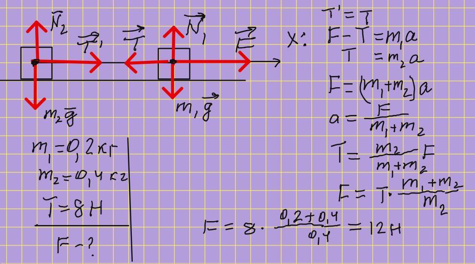 Два бруски масами 0,2кг і 0,4кг зв'язані не вагомою ниткою, лежать на гладенькiй горизонтальній поверхні. З якою силою можна тягти перший брусок, щоб нитка між брусками не розірвалась, якщо вона витримує 8H?
