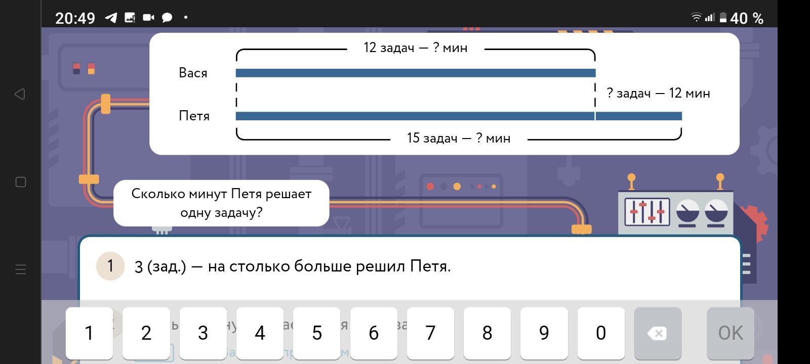 у Васи 12 задач это на 3 меньше чем у Пети, 15, значит нам нужно отнять 12 От 15 и это будет 3,15-12=3