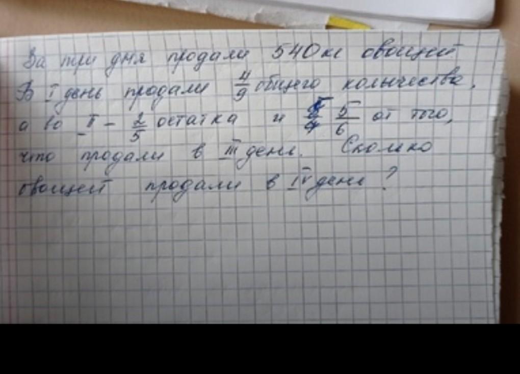 за 4 дня продали 540 кг овощей. в 1 день продали 4/9 общего количества, во 2 день продали 2/5 от остатка, и 5/6 от того что продали в 3 день. сколько овощей продали в 4 день? ещё она ошиблась в начале задачи не за 3 дня а четыре нужно было писать.