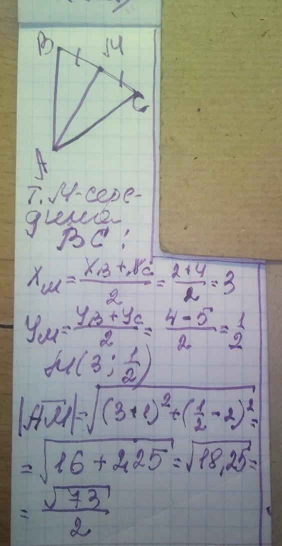 4. У трикутнику ABC відомі координати вершини A(-1;2), B(2;4), C(4;-5). АМ - медіана трикутника. Знайти модуль вектора АМ.