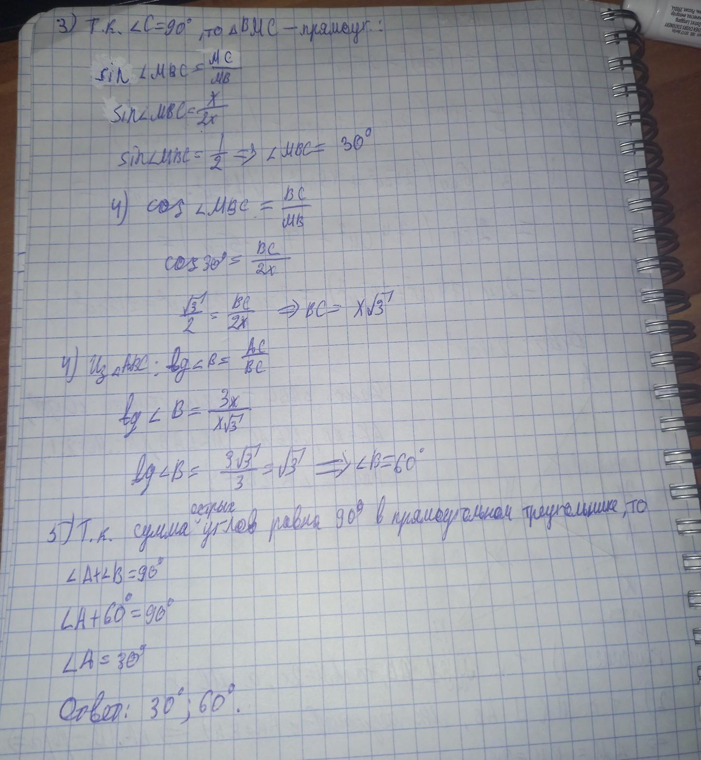 Тогда угол ∠В=90-∠А=90-30=60°