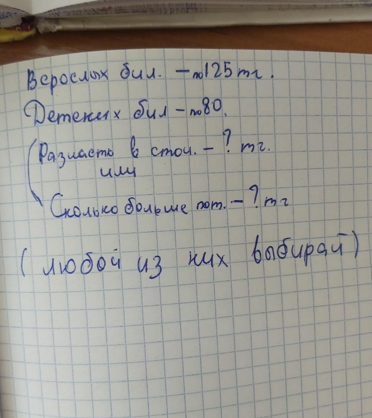 для посещения Комнаты смеха в парке купили два взрослых билетов по 125 тенге опять детских билетов по 80 тенге На сколько больше денег потратили на покупку детских билетов чем взрослых. Решение есть помогите пожалуйста С условием.