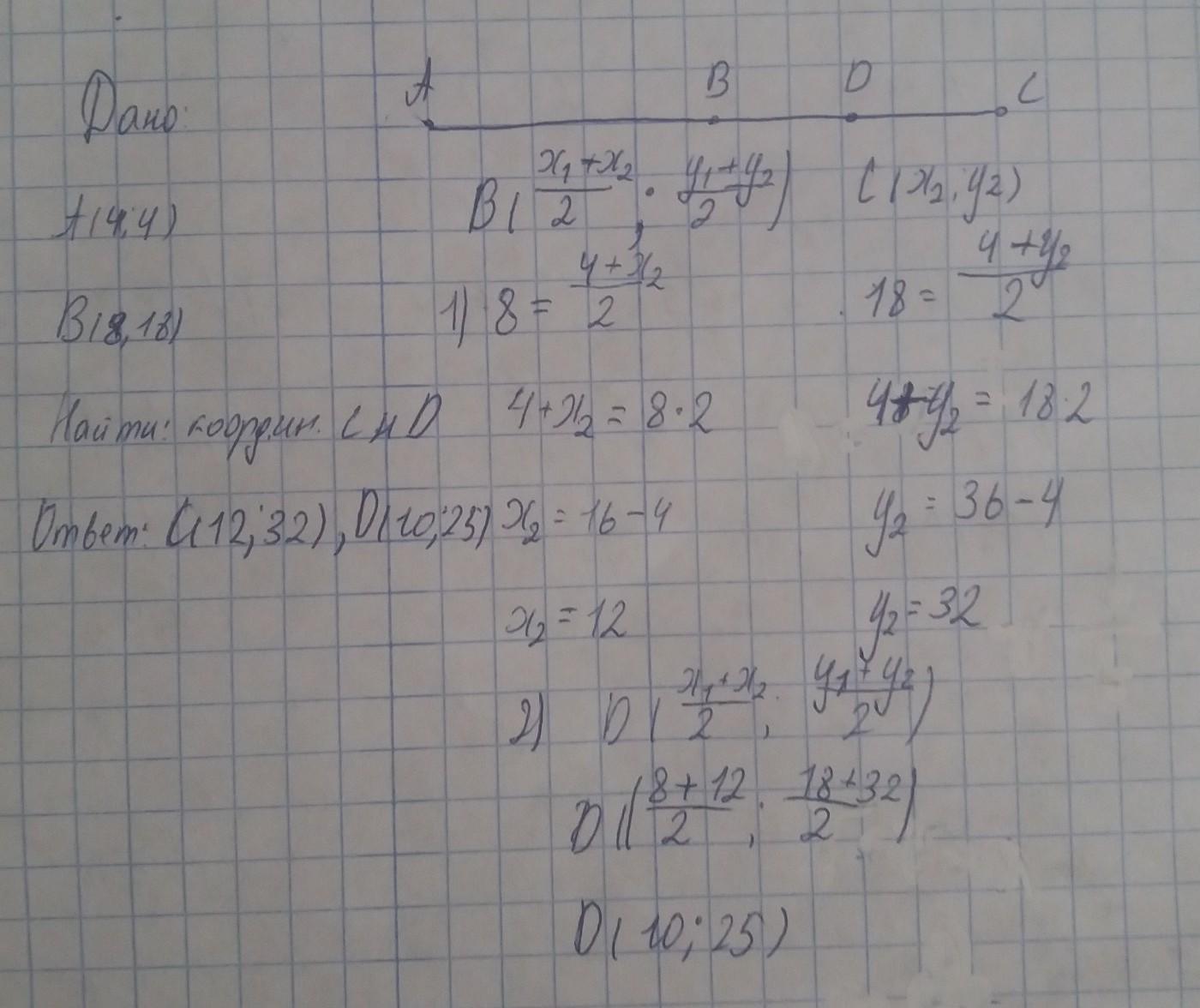 даны точки а(4 4) и в(8 18) найдите координаты этих точек с и д если известно что точка в середина отрезка ас а точка д середина отрезка вс (помогите пожалуйста)