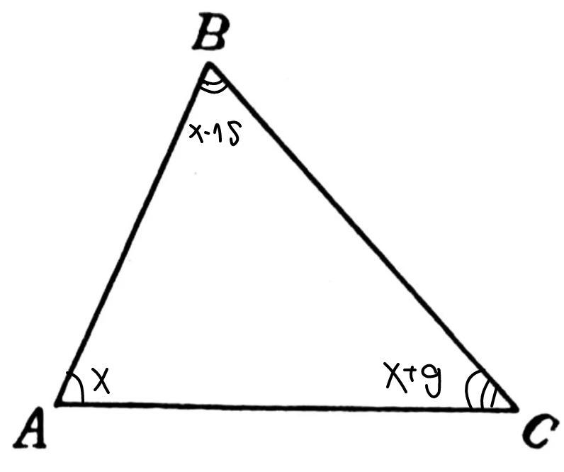 Легче всего решить уравнением. За Х берём угол А, тогда угол С - х+9, а угол В - х-15