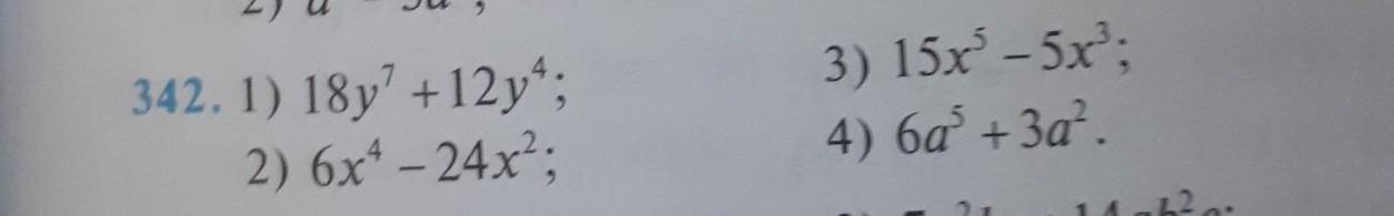 вынесите общий множитель за скобки 342 1)18y^7+12ab^3; 2)6x^4-24x^2; 3)15x^5-5x^3; 4)6a^5+3a^2. Помогите пожалуйста