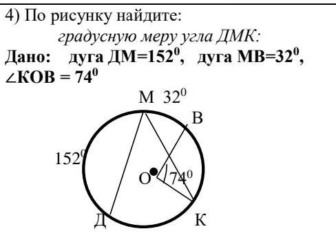 По рисунку найдите: градусную меру угла ДМК: Дано: дуга ДМ=1520 , дуга МВ=320 , ∠КОВ = 740