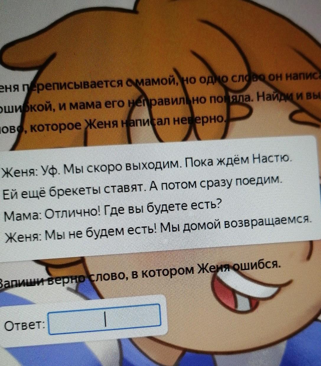 Женя переписывается с мамой, но одно слово он написал с ошибкой, и мама его неправильно поняла. Найди и выдели слово, которое Женя написал неверно.