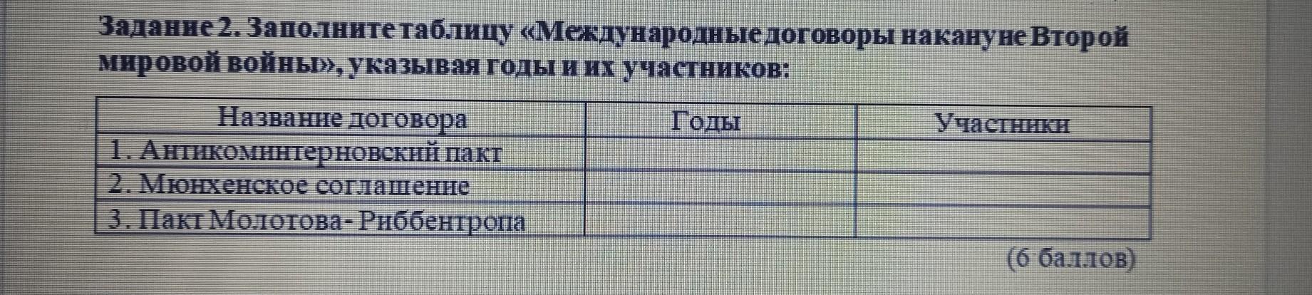 Задание 2. Заполнитетаблицу «Международные договоры накануне Второй мировой войны», указывая годы и их участников: Годы Участники