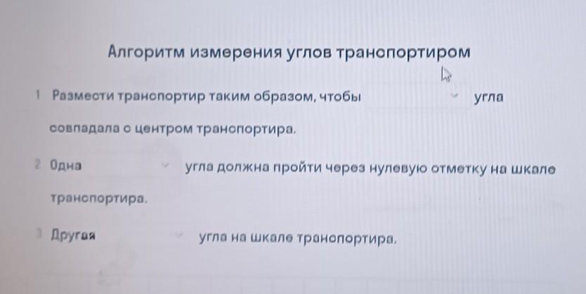 - 1 Размести транспортир таким образом, чтобы _______угла совпадала с центром