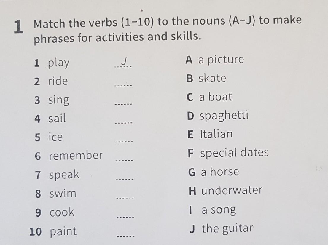 1 Match the verbs (1-10) to the nouns (A-J) to make phrases for activities and skills. J A a picture B skate C a boat 1 play 2 ride 3 sing 4 sail 5 ice 6 remember 7 speak 8 swim 9 cook 10 paint D spaghetti E Italian F special dates G a horse Hunderwater I a song J the guitar