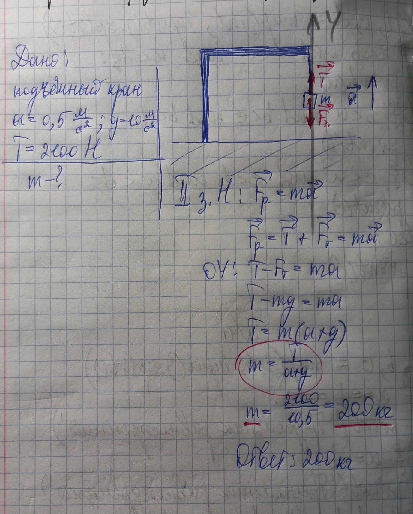 Подъемный кран поднимает груз с ускорением 0,5 м/с2. Сила натяжения троса равна 2100Н. Определить массу груза.
