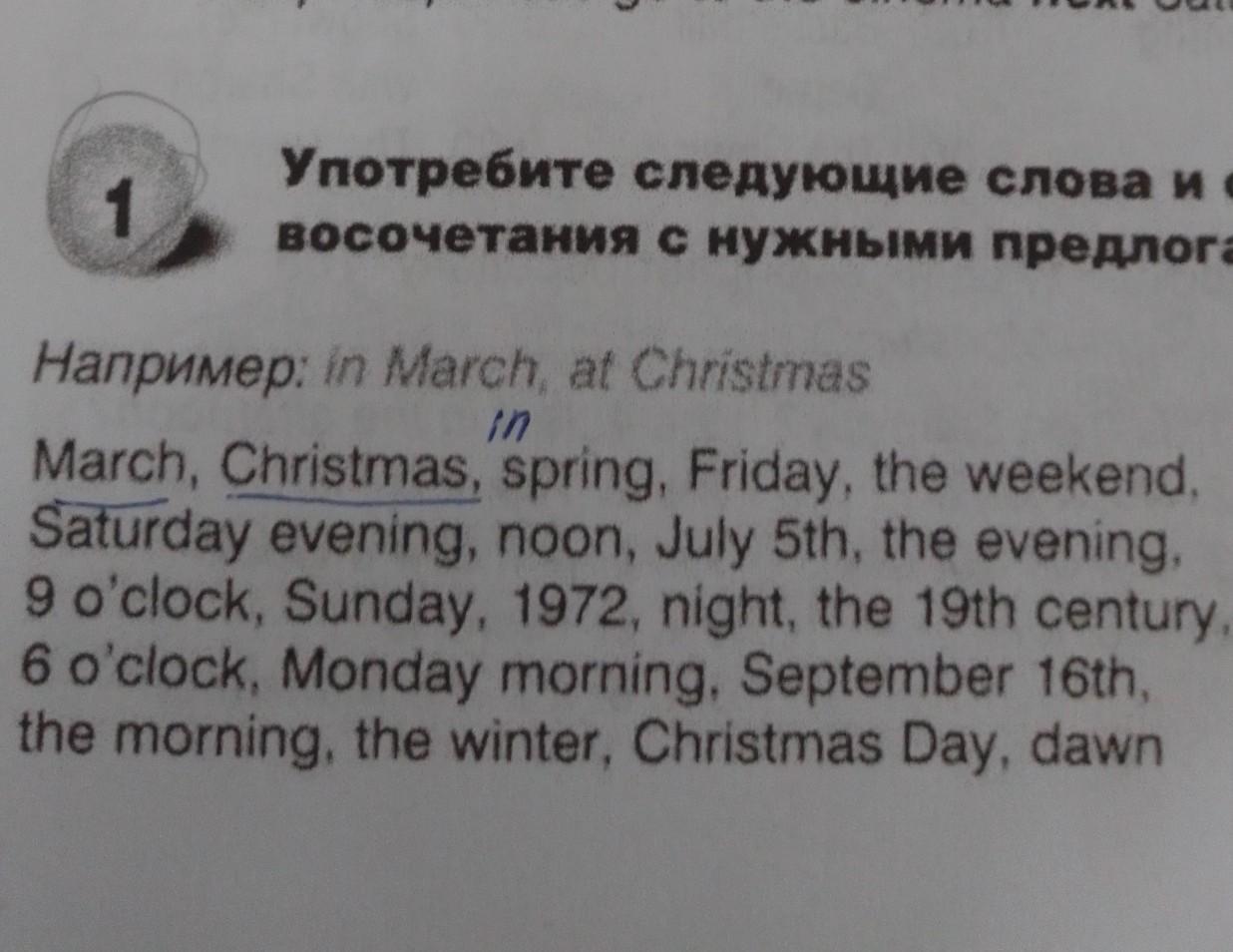 Ответ:in march,at christmas,in spring,on friday,at the weekend,on saturday evening,at noon,on july 5th,in the vening,at 9 o'clock,on sunday,in 1972,at night,at the 19th century,at 6 o'clock,on monday morning,on september 16th,in the morning,in the winter,at christmas day,