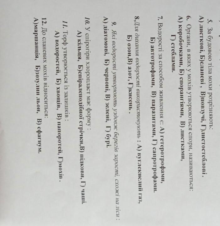 11. Торф утворюється із залишків: А) водоростей, Б) хвощів, В) папоротей, Г)мохів.