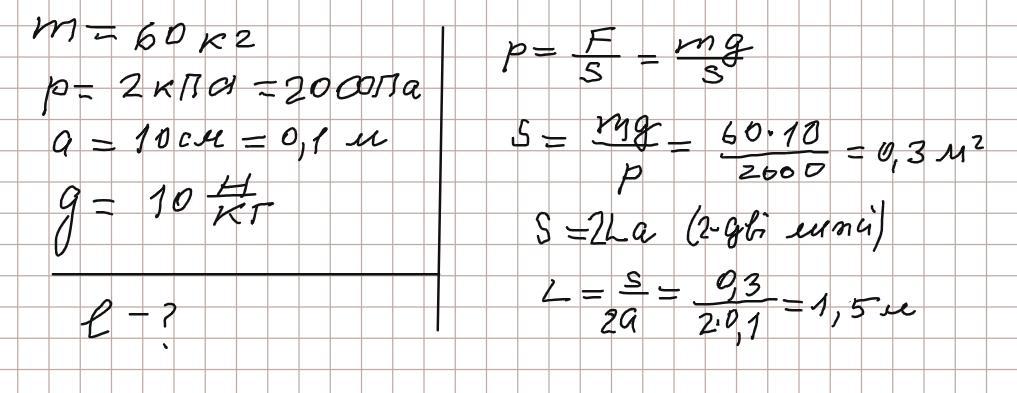 Хлопчик масою 60 кг їде на лижах. Сніговий наст витримує тиск 2 кПа. Яка довжина однієї лижі, якщо її ширина 10 см? Помогите даю 50 баллов. СРОЧНОООООО