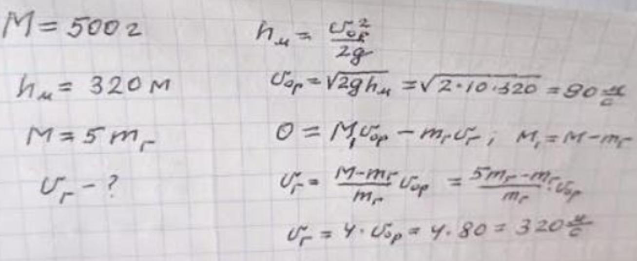 що має разом із зарядом масу 500 г, злітає вертикально вгору і досягає висоти 320 м. Маса заряду становить п'яту частину від початкової маси ракети. Визначити швидкість витікання газів з ракети, вважаючи, що ЗГОРЯННЯ заряду