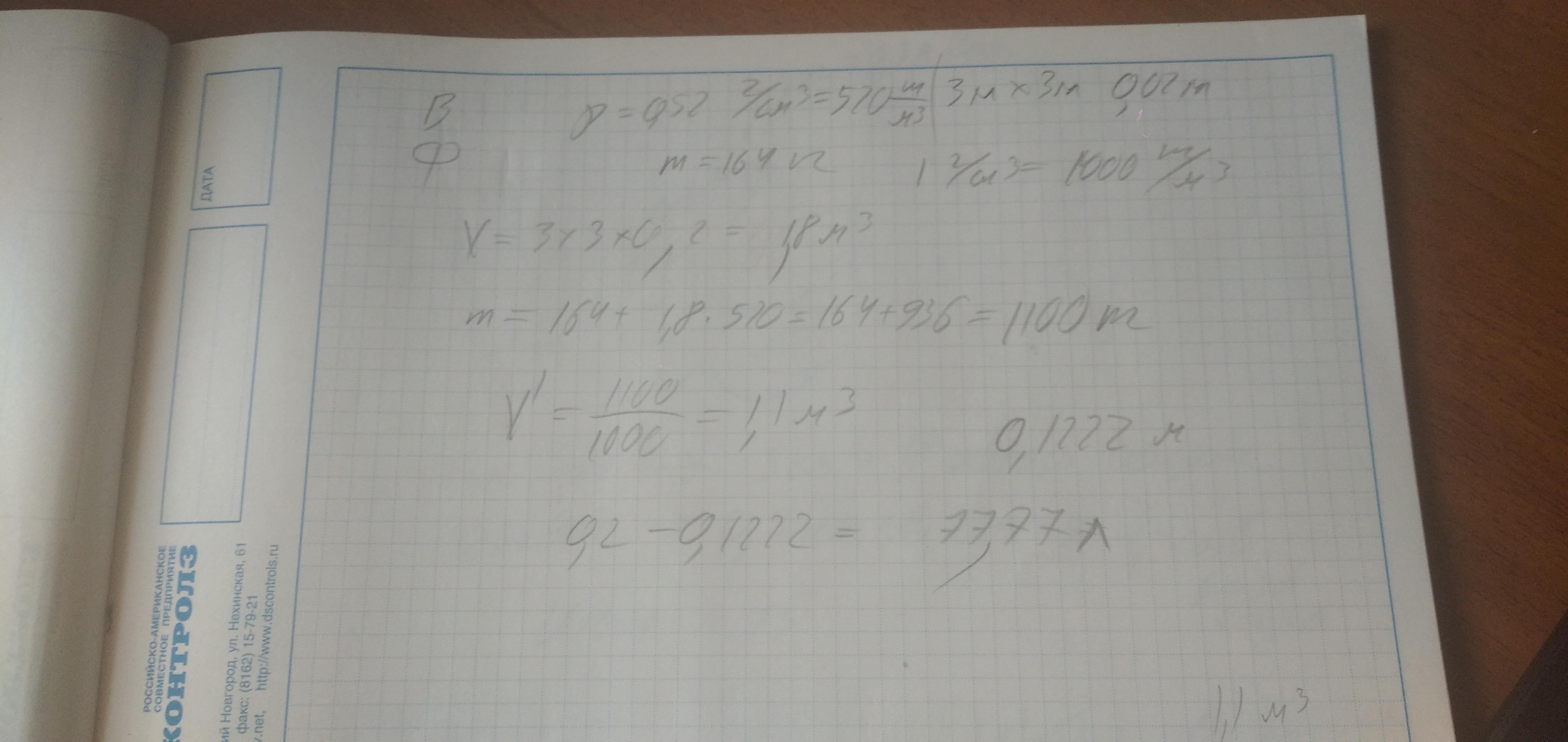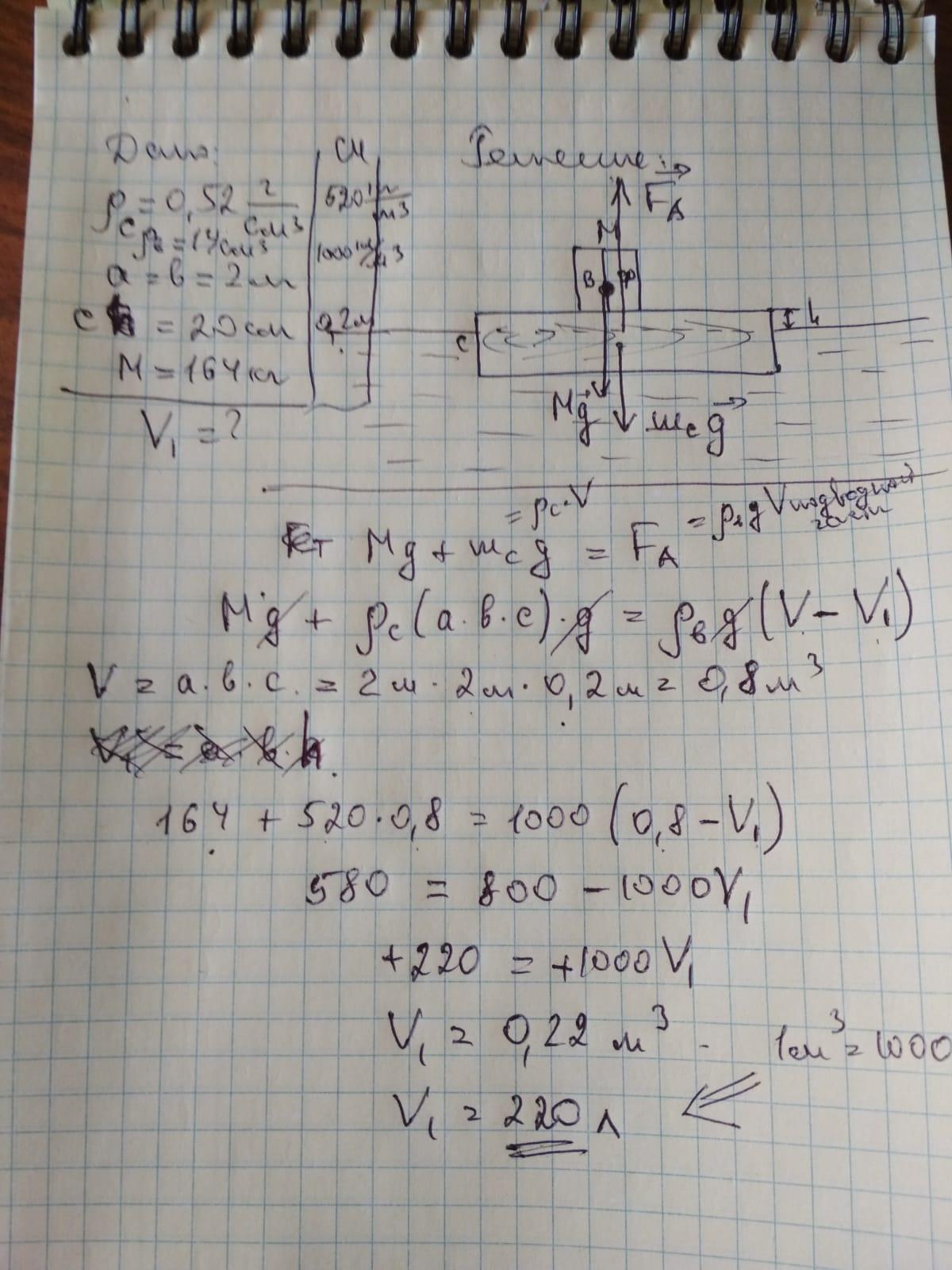 Василий и Федор захотели сплавиться по реке Ирмень. Для этого сделали из сосны плотностью 0,52 г/см3 квадратный плот со стороной 3 м и толщиной 20 см. Общая масса мужчин 164 кг. Определите объём части плота, выступающей над водой, после того как Василий и Федор забрались на плот. Ответ дайте в литрах, округлив до целого числа. Плотность воды 1 г/см3.