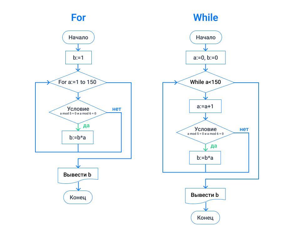 Составить блок-схему Посчитать произведение чисел кратных 5 от 6 до 150. Записать циклом for,потом While.