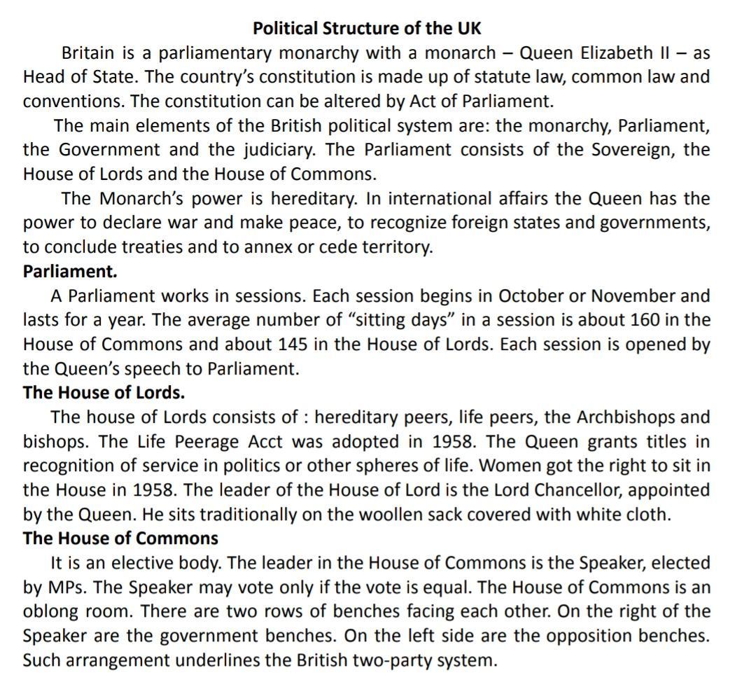 3. the monarchy, Parliament, the goverment and the judiciary (словом "элементы" в тексте называют именно эти 4 ветви, но по заданию их должно быть 3) Поэтому скорее всего речь идет об элементах парламента: the Sovereign, the House of Lords and the House of Commons